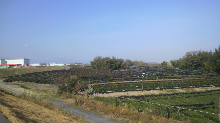 川の堤防沿いに自転車専用道路があるのですが、京田辺や八幡あたりの玉露園は、昔から洪水の度に堆積してきた河川敷の平らな肥えた土壌に、茶の木は植えられているため、堤防の内側にも、多くの茶園が広がっています。自転車をこぎ、このような風景をみながら、山の斜面に肥料分が停滞しないよう昔はわざわざ縦畝に植えられていた月ヶ瀬の茶園とは、まったく正反対の立地条件であることを改めて実感しました。このような月ヶ瀬とは対照的な立地条件の茶園をみると、月ヶ瀬の立地条件を活かしたお茶づくりを、どのようにしていけば良いか、はっきりと再確認できた二日間でもありました。