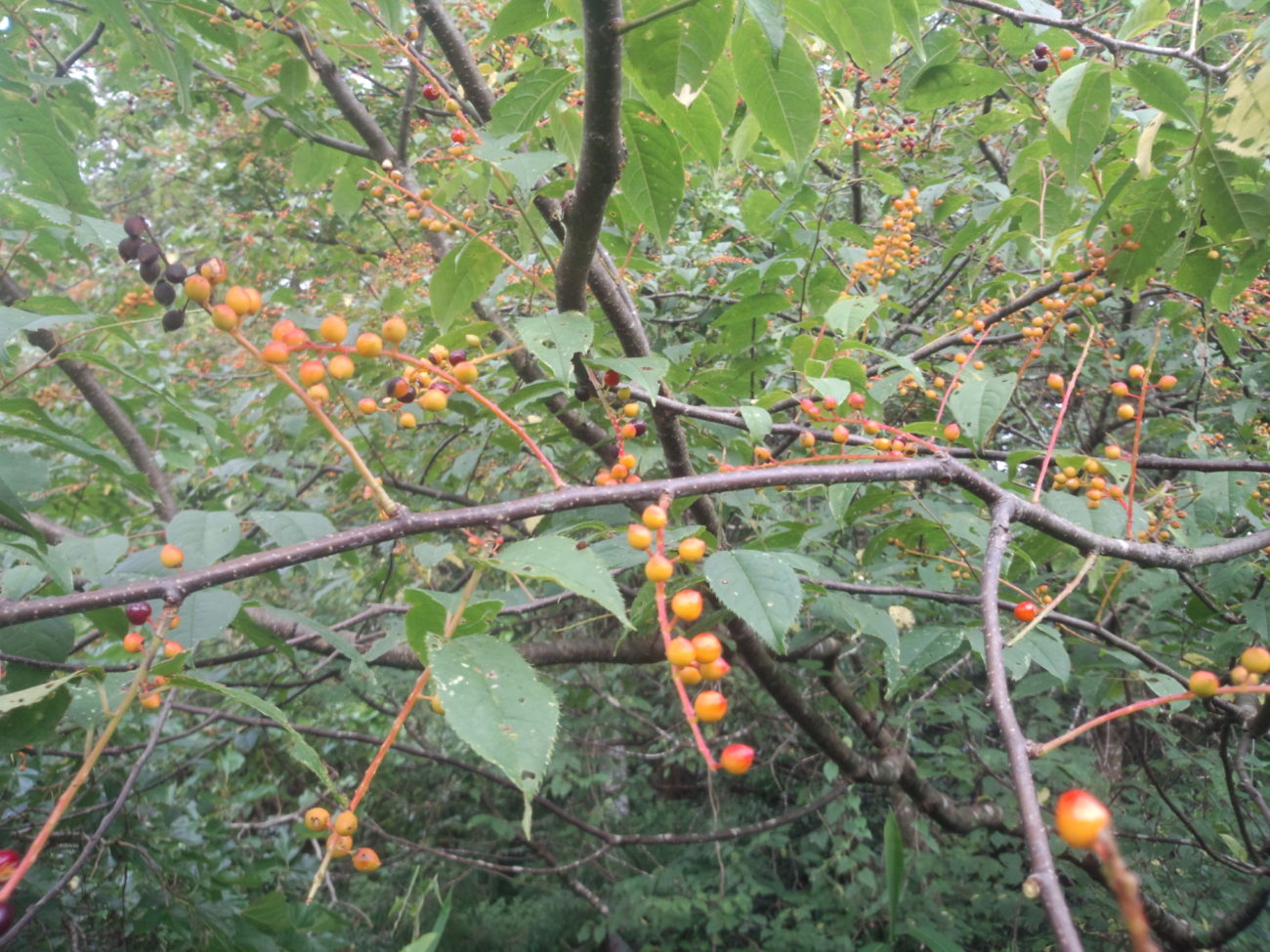 シヲダニ2茶園に植えた「べにふうみ実生」幼木園での除草作業の際に、ふと隣接する山を眺めたところ、サクランボが鈴なりになっていました。調べたところ「ウワミズザクラ」という山桜の実だったので、食べてみると杏子の様な香味があり、甘くて美味しかったです。これから、実は熟して、黒色になっていきます。