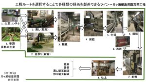 また、例えばオーダーメイドや品種特性を活かして数ロットだけ異なる種類の緑茶を作る必要が生じた場合でも、工程ルートを変更するだけで玉緑茶や釜炒り茶も柔軟に製茶できるようになりました。。
