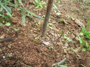 実生茶園づくりをする際、自然淘汰によって間引かれる(枯れる)ことは、自然なことだと考えていますが、今回のように全滅したポイントが多発したのは初めてのことでした。原因としては、『「ゆめかおり」から採種した実生は発芽後の初期成育が悪い特性を持っている』あるいは『花崗岩の礫が多く混じる土壌であることから活着率が低い』といったことではないかと考えています。