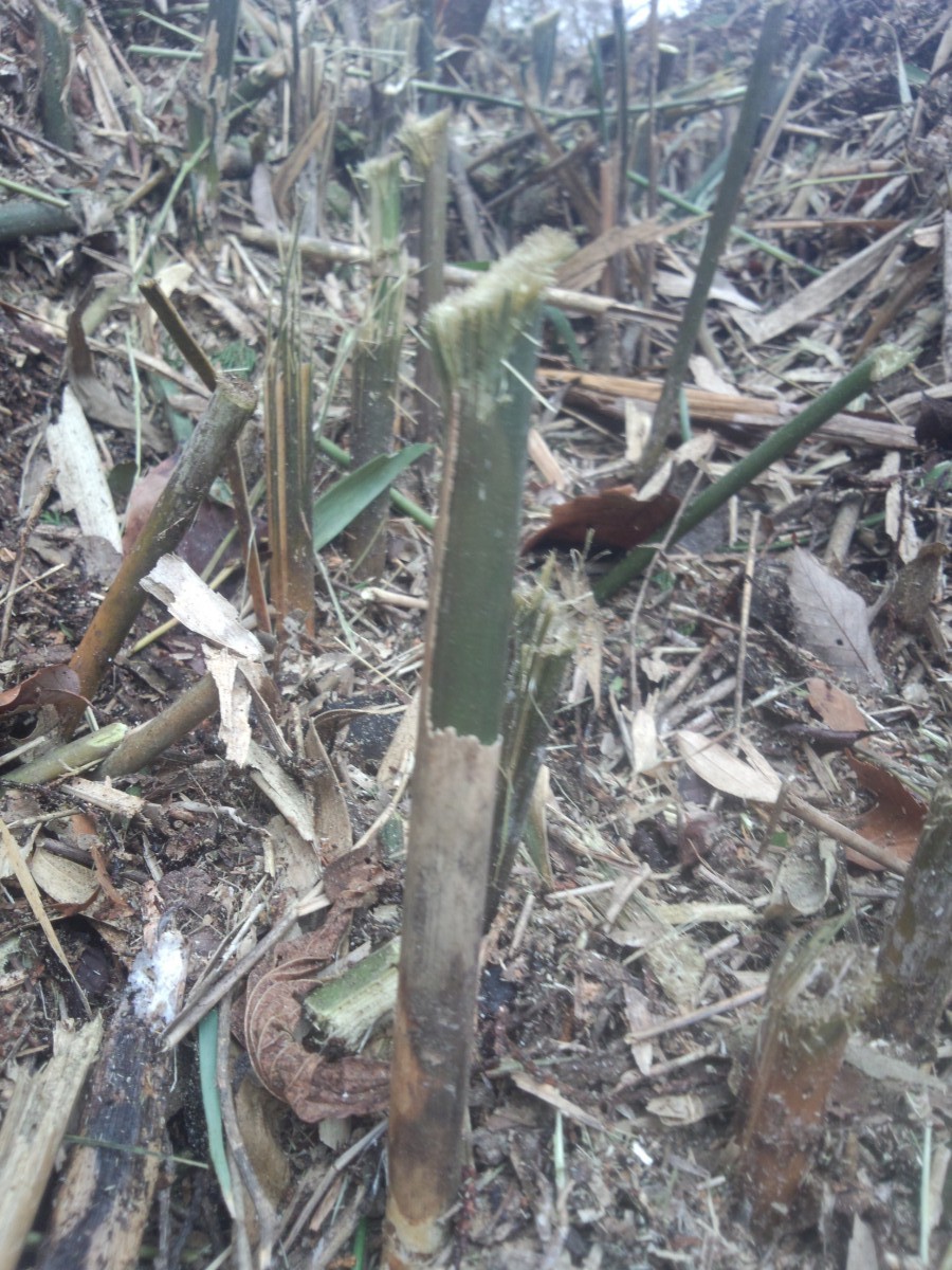 昔の人が、笹根が茶園に入ってこないよう、土手の下側に、溝まで掘った理由を、もう一度よく考え、今後は茶園からもっと離れたところまで笹根が衰退するするよう、継続して、茶園周辺の笹を刈り続けていきます。