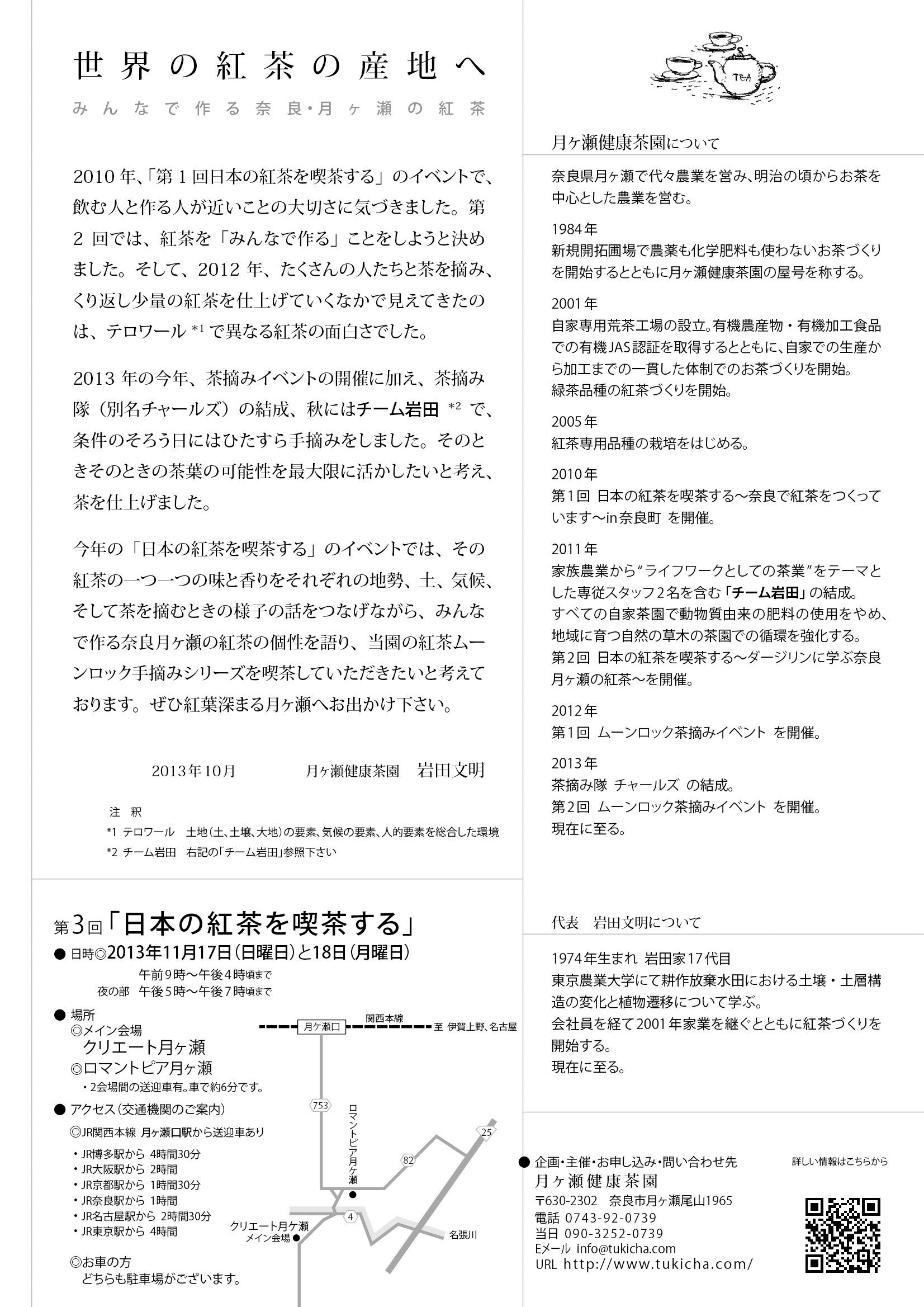 第2回では、飲む人も作る人も、皆が一緒になって「特別=手摘みの紅茶」をつくり、喫茶する新しい提案をさせて頂きました。その後、月ヶ瀬健康茶園茶摘み隊(別名チャールズ)の結成、2012年6月2日、2013年9月22日30日の茶摘みイベントを経て、第3回は「みんなでつくる奈良月ヶ瀬の紅茶」のテーマで本日、喫茶イベントを開催させて頂きます。