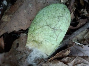 落ち葉集めと回収中、時々みかける「やままゆ(山繭)」。日本の在来種の野蚕で、天蚕ともいいます、繭は鮮やかな緑色で、とてもきれいで、よく目立ちます。